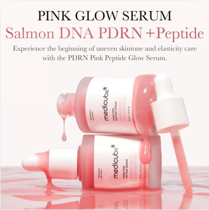 The Medicube Pink Glow Serum Set revitalizes skin with Salmon DNA and Peptides, enhancing elaticity, radiance, and reducing fine lines for a youthful glow.